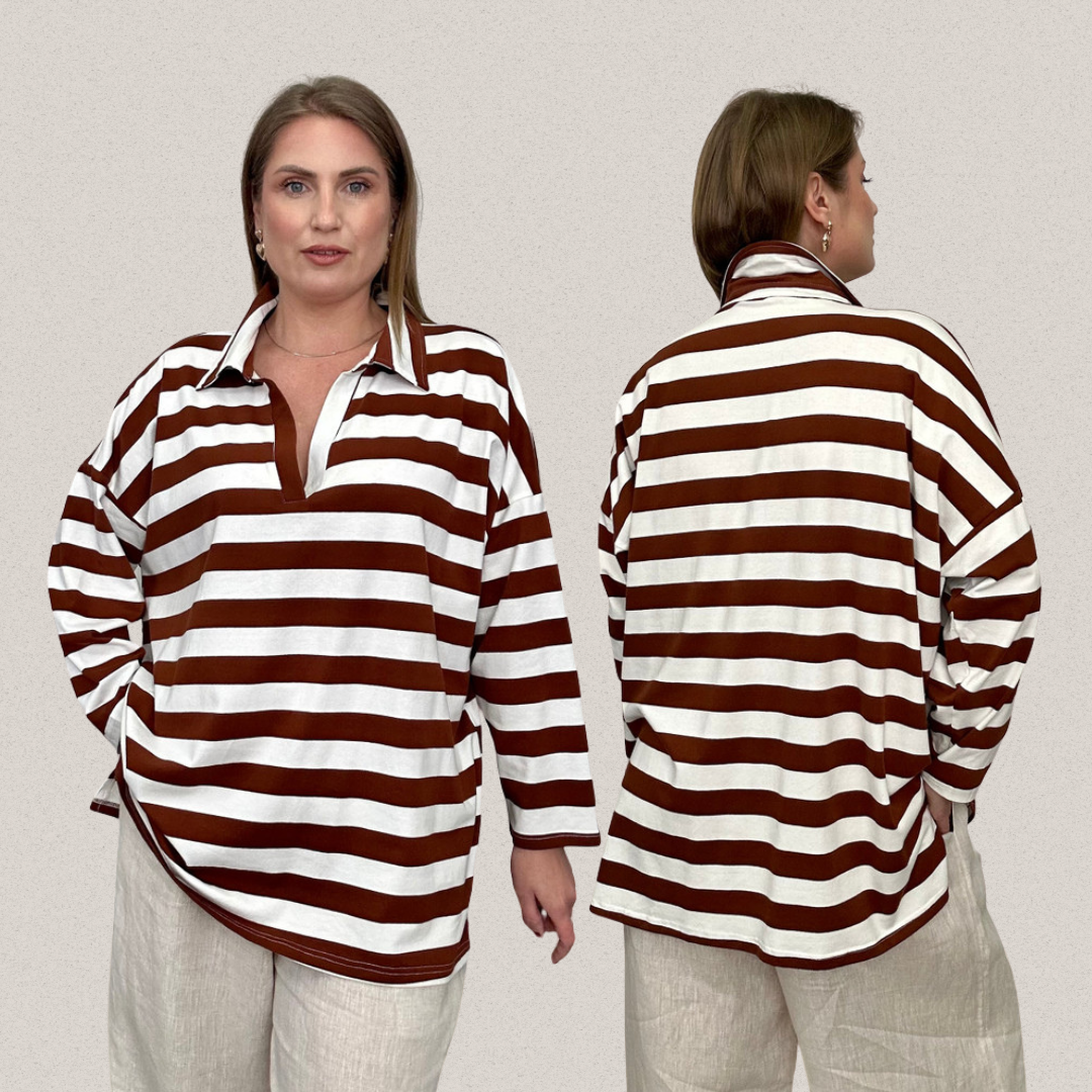 The KL909 top in chocolate is a striped polo that offers both comfort and style. Crafted from a cotton-rich stretch blend, this striped polo-style top features a flattering V-neck, drop shoulders, and a high-low hem. A versatile pick for smart casual spring outfits.