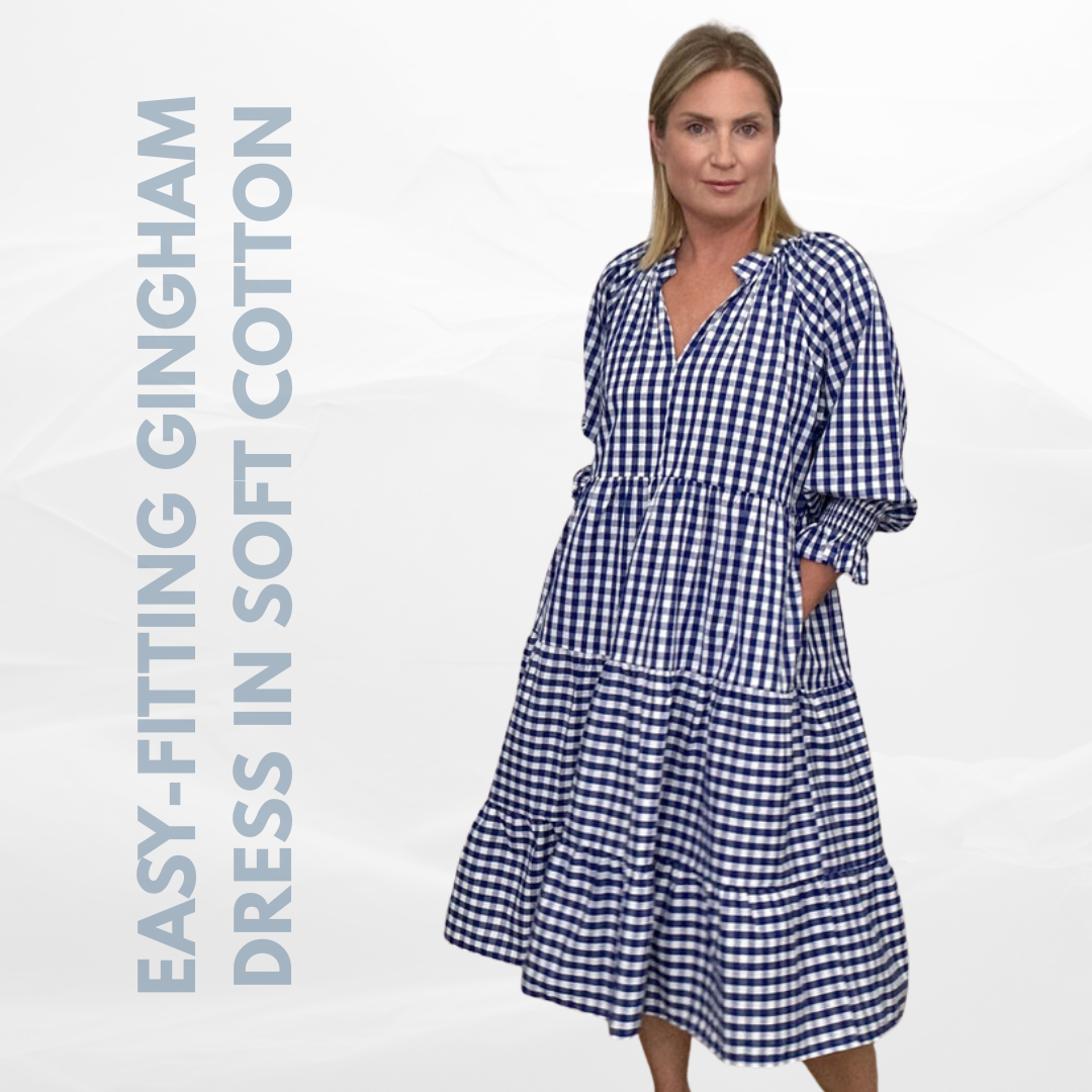 An easy-fitting gingham dress in soft cotton, available in S/M and L/XL. Ideal for warm days, it’s the ultimate throw-on-and-go spring dress.
