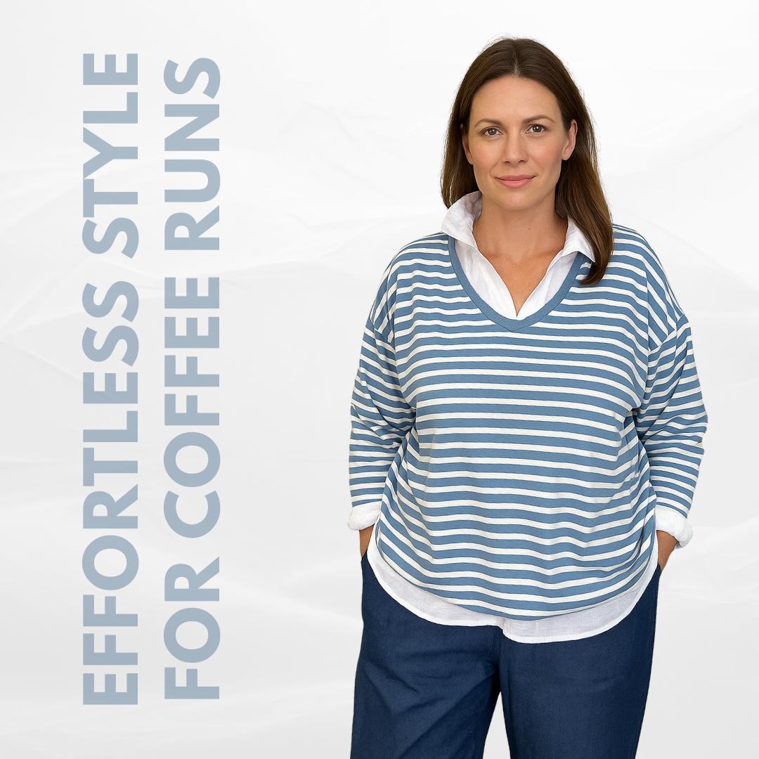 With a soft V neckline and subtle blue/milk stripes, this spring-ready cotton blend top offers effortless style for coffee runs or relaxed dinners.