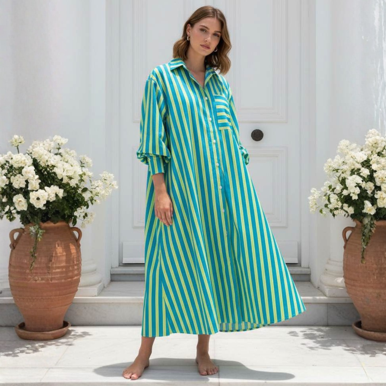The Kiik Luxe KL925 Shirt Dress in Turquoise is a breathable cotton style designed to flatter, featuring a button-through front, waist-defining belt, and functional pockets for effortless everyday wear.